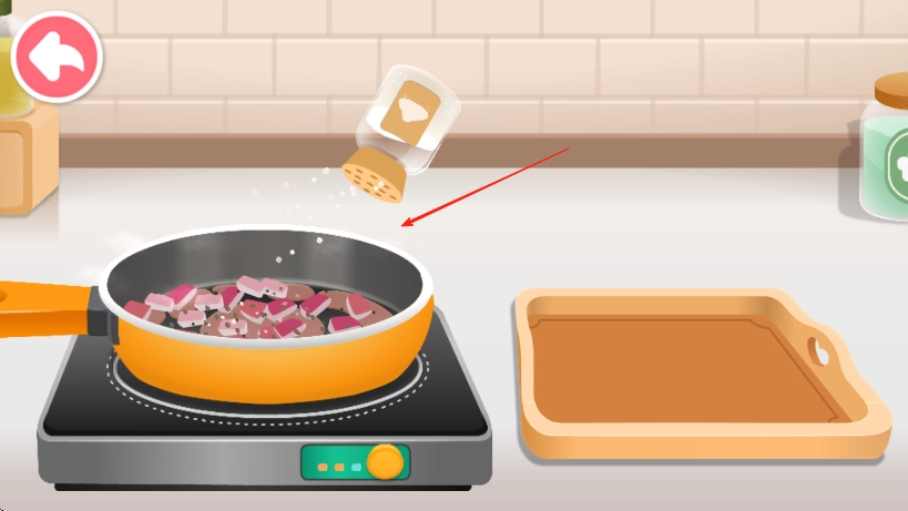 3、观察食材烹饪状态,在合适时机点击调料瓶,加入调料调味,完成食物制作,装盘即可。