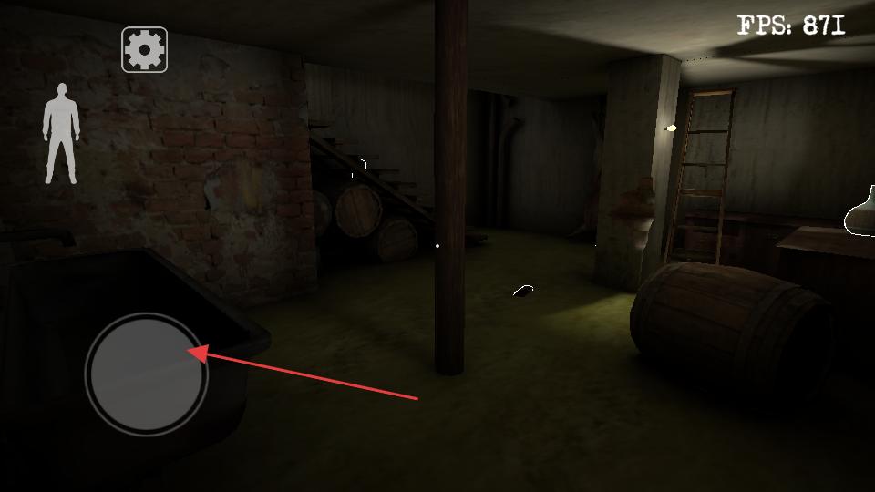 3、进入昏暗房间场景,操控左侧圆形摇杆,控制角色在房间内移动,探索木桶、楼梯周边区域,搜寻线索推进进程。