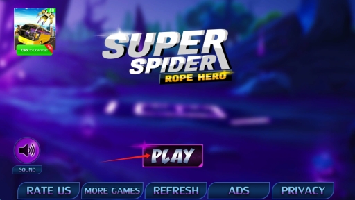 1在Super-Spider-Rope-Hero的界面中,点击PLAY按钮,即可开始你的城市冒险之旅,化身为绳索英雄,并通过点击来启动游戏。
