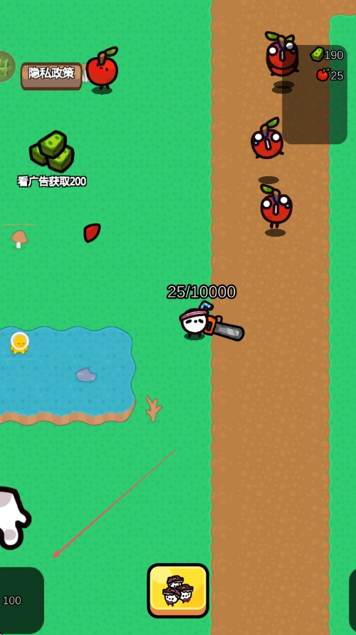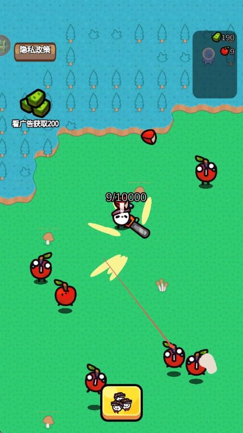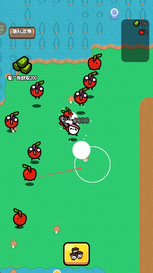 4、遇到变红的苹果敌人时持续点击攻击按钮攻击敌人击败后获取Exp提升等级同时收集掉落道具。