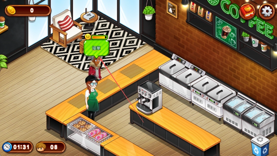 3、咖啡制作完毕后,指示服务员把咖啡送到相应顾客手中,从而获得金币收入。