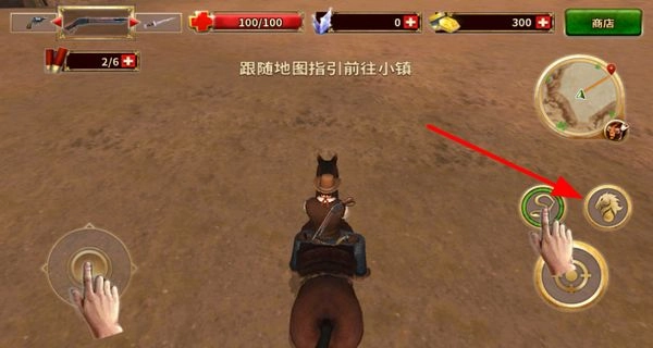 4、可通过点击骑马相关按钮实现骑马移动,随后依照地图指引前往小镇,迅速抵达指定地点。