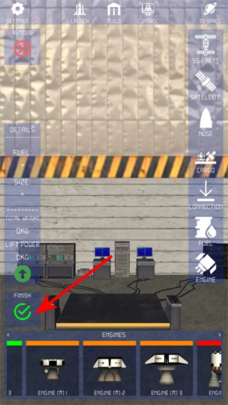 2. 进行部件组装操作,进入建造界面后,挑选火箭引擎等部件并加以组装,随后点击完成按钮,以此确认部件已安装到位,进而推动建造进程。