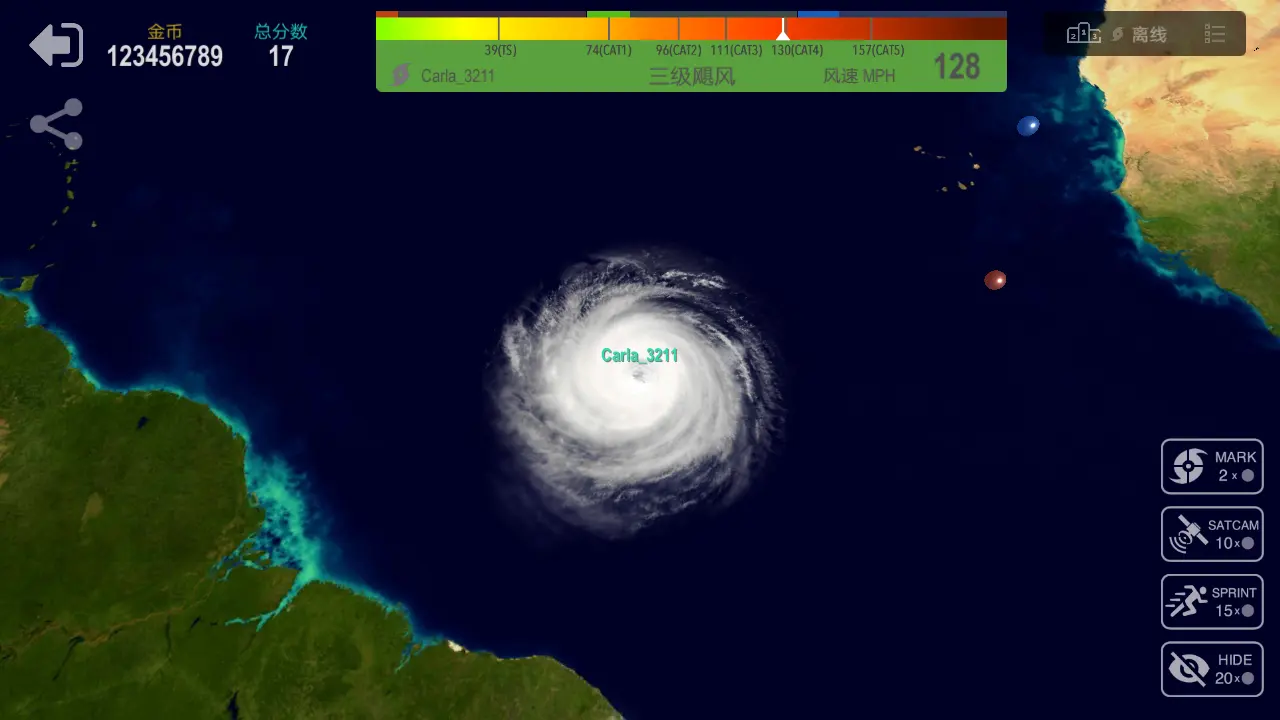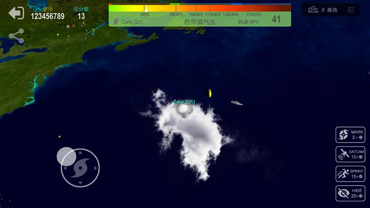 《飓风大作战》的玩法与贪吃蛇类似,玩家主要通过收集能量来达成最终目标。操作方式为滑动屏幕实现移动,右下角设有移动加速按钮。需要玩家留意的是,能量来源于空气中或海面上的水与热能,尽量去“猎杀”规模比自己小的飓风,这样能让自身成长得更快!