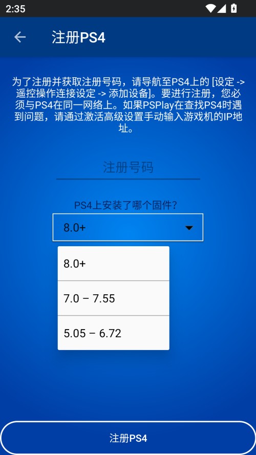 3、填入注册号码,挑选该设备所安装的固件版本。最后点击“注册PS4”按钮即可完成操作。